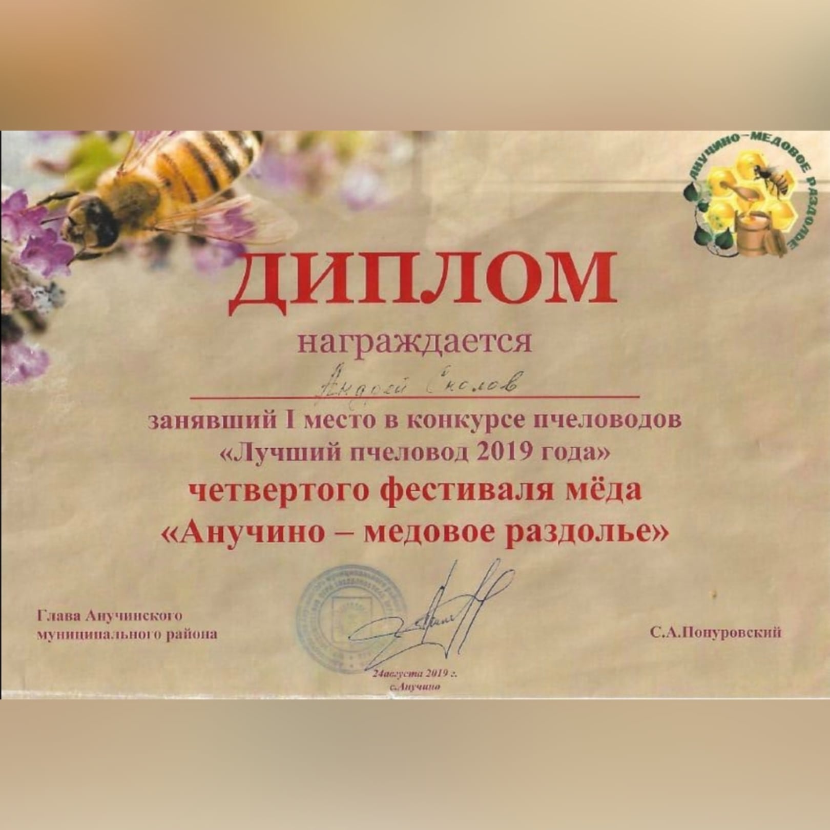 アンドレイさんの蜂蜜は毎年行われる沿海地方の蜂蜜コンクールにて「ベスト養蜂家」として高く評価されています。